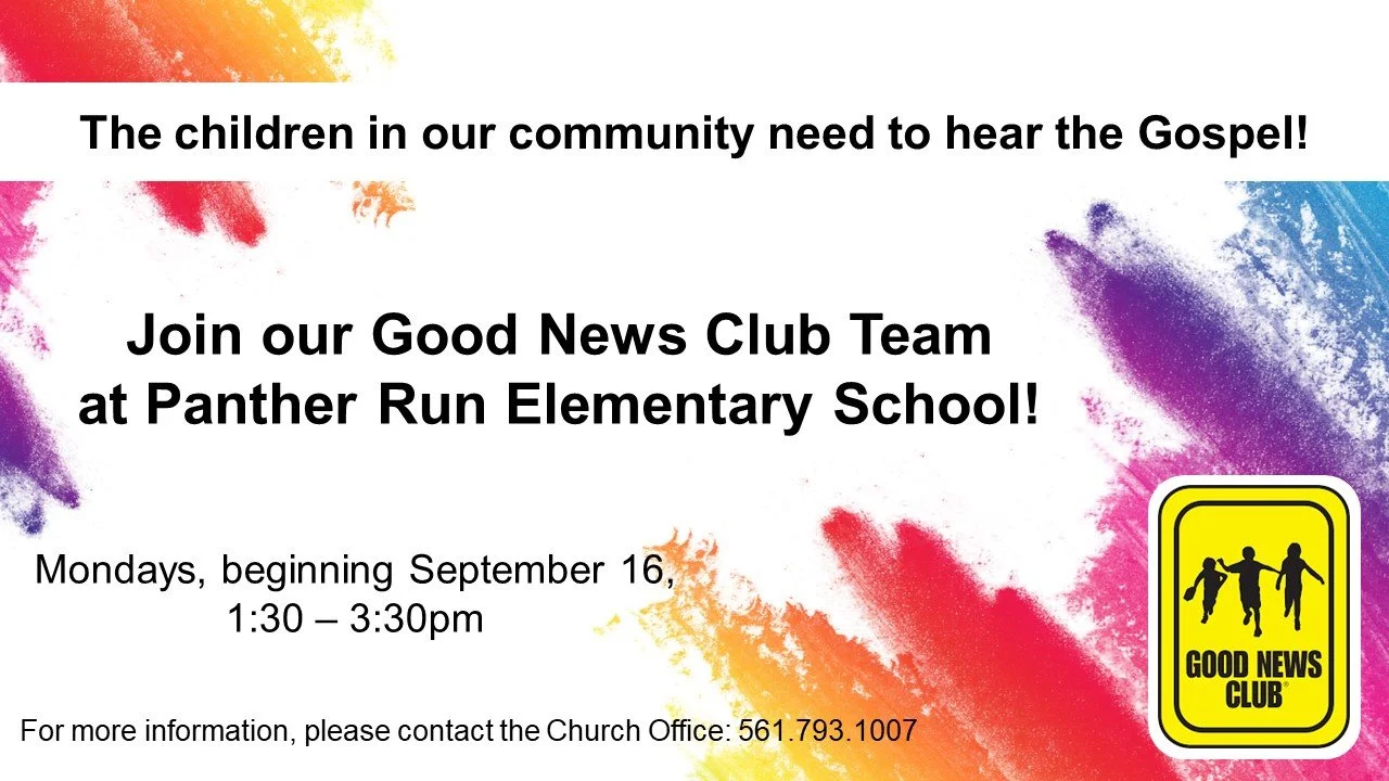 Our Good News Club Team at Panther Run Elementary Needs You! Praise God that we received everything that we were praying for as far as the beginning and running of the Good News Club this year. Come and be a part of this exciting and growing ministry to Panther Run Elementary School. Mondays, beginning September 12, from 1:30 to 3:30pm. Please contact Bonnie Sturgis (561-793-1007) if you are interested.
