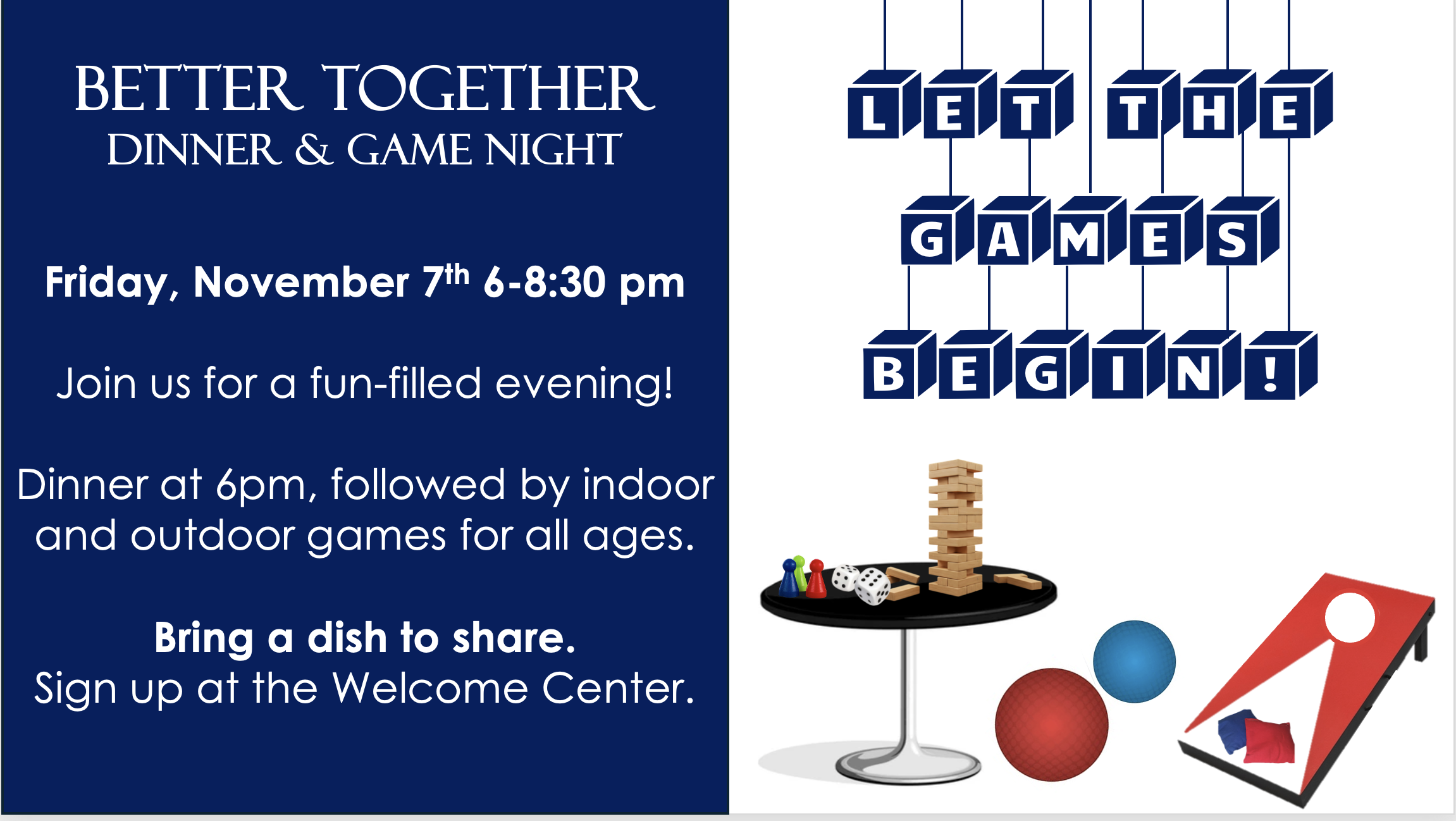 Join us for a night of fellowship and fun games. The evening will begin with dinner … then let the games begin! We will have something for the whole family! Whether you enjoy outdoor relay games or indoor table games, there’s something for everyone. Sign up at the Welcome Center to come and bring a main dish to share.