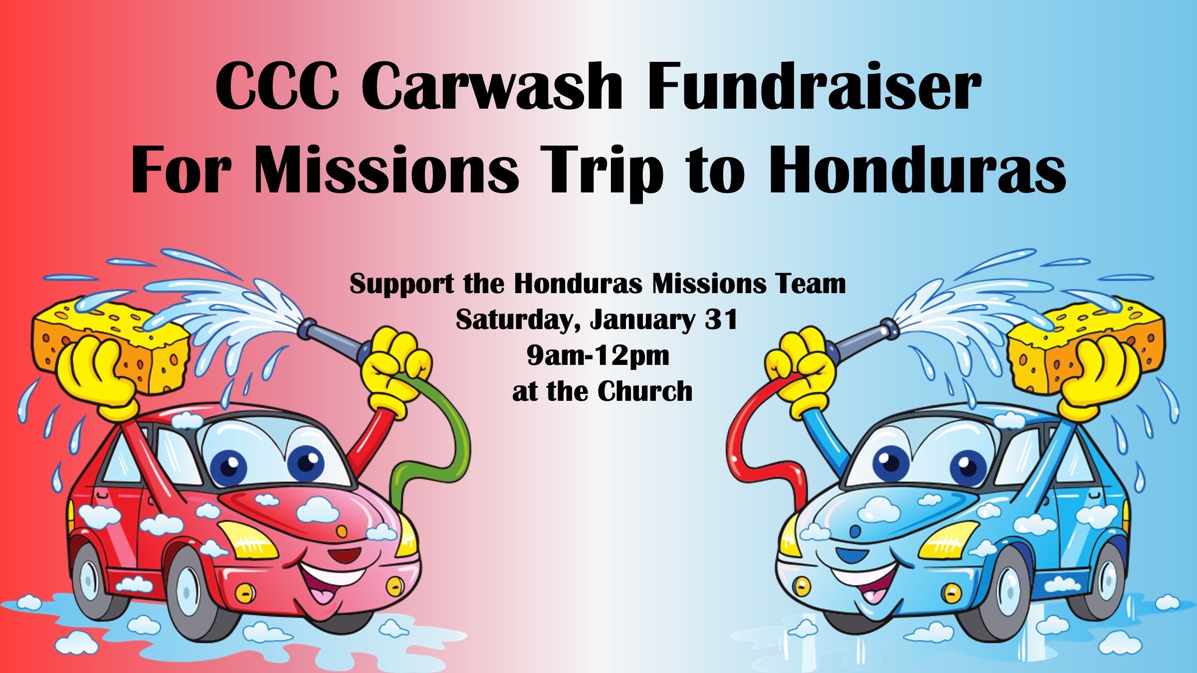 The Honduras Missions team will hold a carwash fundraiser at CCC on Saturday, January 31, from 9am-12pm (donations appreciated). And for an added bonus, there will be a bake sale for you to shop while you wait for your car. The team is grateful for your support!